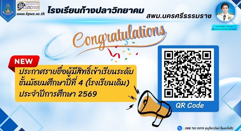 ประกาศรายชื่อผู้มีสิทธิ์เข้าเรียนระดับชั้นมัธยมศึกษาปีที่ 4 (โรงเรียนเดิม) ประจำปีการศึกษา 2569